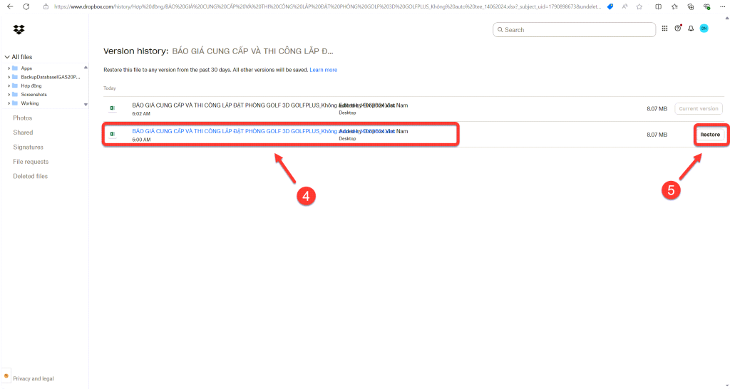 Hướng dẫn khôi phục lại phiên bản của tập tin trên Dropbox
